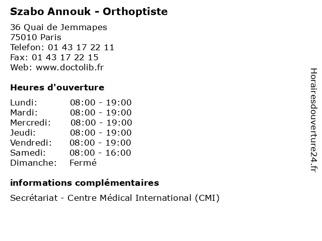 1 Salima Khanzy - Orthoptiste (Distance: nan km) 36 Quai de Jemmapes, 75010 Paris khanzy, ophtalmologique, orthoptiste, salima, strabologie, suivi 2 Fanny Haziza - Orthoptiste (Distance: 0,42 km) 18 Rue Béranger, 75003 Paris fanny, haziza, orthopedie, orthoptiste, orthopédique, trauma, traumatologie, traumatologique 3 Coralie Hugo - Orthoptiste (Distance: 1,19 km) 13 Rue Manin, 75019 Paris cabinets, coralie, hugo, médecins, orthoptiste, secretariat, thérapies 4 Magali Morel - Orthoptiste (Distance: 1,48 km) 106 Rue Réaumur, 75002 Paris magali, morel, médecin, médecine, médical, orthoptiste, pharmaceutique, traitement 5 Mardoché Tordjman - Orthoptiste (Distance: 1,73 km) 363 Bis Rue des Pyrénées, 75020 Paris mardoché, orthopedie, orthoptiste, orthopédique, tordjman, trauma, traumatologie, traumatologique 6 Elisabeth Galloula - Orthoptiste (Distance: 1,87 km) 3 Rue du Maroc, 75019 Paris elisabeth, galloula, médecin, médecine, médical, orthoptiste, pharmaceutique, traitement |