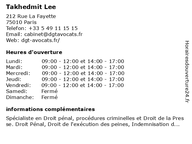 1 Maître Lee Takhedmit - Avocat (Distance: 0,01 km) 212 Rue La Fayette, 75010 Paris avocat, avocats, cabinet, conseils, contentieux, juridique, justice, lee, litiges, maître, services, takhedmit 2 Restaurant Takhedmit (Distance: 1,16 km) 46 Rue Mathis, 75019 Paris ahmed, café, restaurant, restaurants, takhedmit 3 Dr Djamila Takhedmit-Hidouche - Phlébologue (Distance: 3,09 km) 10-12 Rue Eugène et Marie-Louise Cornet, 93500 Pantin consultation, de, djamila, dopplers, dr, hidouche, maladie, médecin, phlébologie, phlébologue, pratique, santé, takhedmit, thérapie, traitement, écho 5 Dr Sylvie Takhedmit - Médecin généraliste (Distance: 5,18 km) 87 boulevard du Port Royal, 75013 Paris consultation, docteur, dr, généraliste, med, médecin, sylvie, takhedmit, traitement 6 |