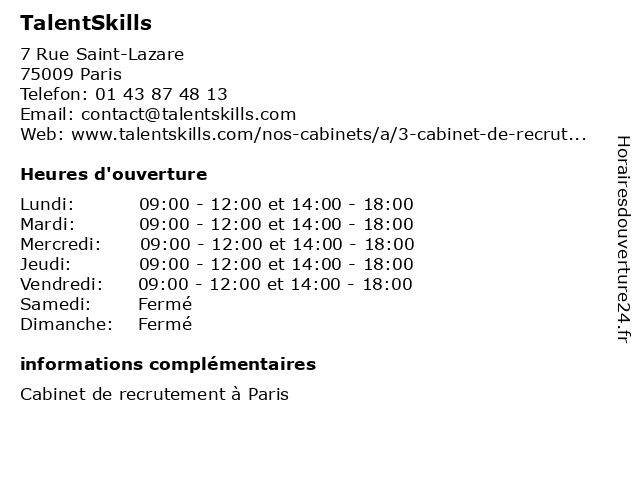 1 TalentSkills Paris (Distance: 0,02 km) 7 Rue Saint Lazare, 75009 Paris aide à la rédaction de cv, conseil en ressources humaines, consultant pour l'emploi, paris, recruteur, talentskills 2 TalentSkills Paris (Distance: 1,14 km) 22 Rue De L'arcade, 75008 Paris agence de recrutement, aide à la rédaction de cv, conseil en ressources humaines, conseiller en formation, consultant pour l'emploi, paris, talentskills 3 Randstad Risesmart - Paris (Distance: 0,18 km) 39 Rue Saint-Lazare, 75009 Paris cabinet de consulting rh, conseils en recrutement, paris, randstad, risesmart 4 Badenoch + Clark (Distance: 2,74 km) 20 avenue Hoche, 75008 Paris badenoch, clark, conseil rh, formation, gestion des talents, leadership, recrutement 5 Isabelle Mayadoux - Avocat spécialisé en droit social & RH (Distance: 3,01 km) 85 Rue de Rennes, 75006 Paris avocat, avocats, cabinet, droit, en, isabelle, mayadoux, représentation, rh, service, social, spécialisé 6 RH Solutions (Distance: 3,56 km) 2 Rue Villaret De Joyeuse, 75017 Paris rh, services, services aux entreprises, solutions |