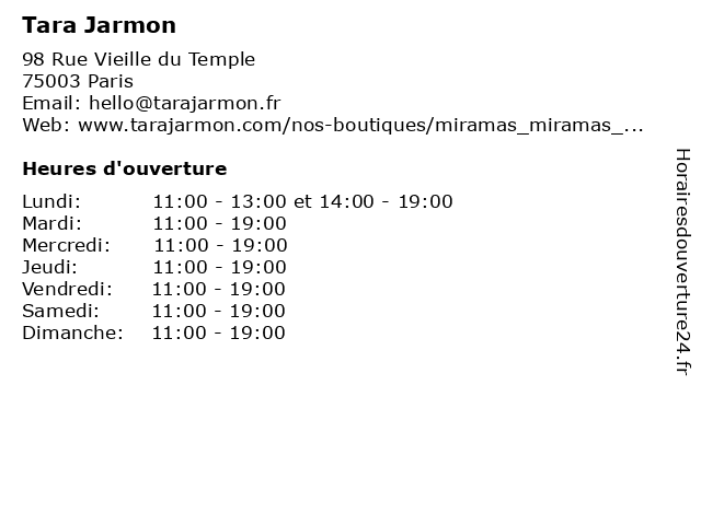1 Tara Jarmon (Distance: 0,73 km) 52 rue de Rivoli, 75004 Paris accessoires, enfants, filles, garçons, habillement, jarmon, mode, pret à porter, tara, vêtements 2 Tara Jarmon (Distance: 2,24 km) 18 rue du Four, 75006 Paris accessoires, enfants, filles, garçons, habillement, jarmon, mode, pret à porter, tara, vêtements 3 Tara Jarmon (Distance: 2,53 km) 75 rue des Saints-Pères, 75006 Paris accessoires, enfants, filles, garçons, habillement, jarmon, mode, pret à porter, tara, vêtements 4 Tara Jarmon (Distance: 2,63 km) 40 boulevard Haussmann, 75009 Paris accessories, beauté, chaussures, galeries, jarmon, lafayette, maison, mode enfants, mode femme, mode homme, sport, tara 5 Tara Jarmon (Distance: 2,83 km) 400 rue Saint-Honoré, 75001 Paris accessories, beauté, chaussures, jarmon, maison, mode enfants, mode femme, mode homme, sport, tara 6 Tara Jarmon (Distance: 4,43 km) 73 avenue des Champs-Elysées, 75008 Paris accessoires, boutique, habillement, jarmon, mode, tara, vetement |