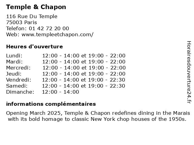 | Vendredi | 12:00-14:00 et 19:00-22:30 |