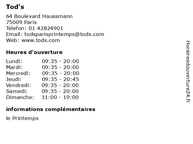 1 Tod's (Distance: 0,30 km) 40 Boulevard Haussmann, 75009 Paris accessoires, chaussures, homme, magasins, mode, tod, tod's 2 Tod's (Distance: 0,75 km) 17-21 rue du Faubourg Saint-Honoré, 75008 Paris accessoires, chaussures, mode, tod's 3 Tod's (Distance: 2,40 km) 44-46 Rue du Dragon, 75006 Paris accessoires, chaussures, magasins, mode, tod, tod's 4 TOD - Talents Ongoing Disruption (Distance: 2,01 km) 18 rue Surcouf, 75007 Paris cabinet, conseil, disruption, humaines, ongoing, recrutement, ressources, talents, tod 5 6 Des Petits Hauts - Paris Haussmann 2 (Distance: 0,00 km) 64 boulevard Haussmann, 75009 Paris accessoires, chaussures, des, habillement, haussmann, hauts, mode, paris, petits, porter, pret, sacs, vêtements |