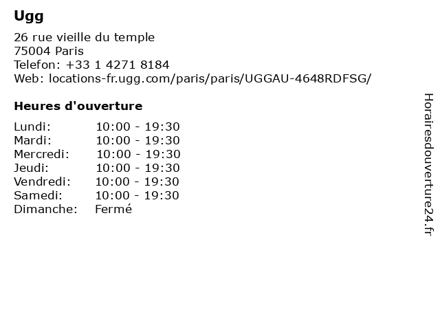 1 Ugg (Distance: 2,01 km) 46 - 48 rue du four Saint Germain, 75006 Paris boutiques, chaussures, mode, ugg 2 UGG Chaussures (Distance: 31,16 km) 3 cours de la Garonne, 77700 Serris bottes, boutique, chaussures, femmes, hommes, sandales, ugg 3 Chevignon (Distance: 0,03 km) 21 Rue Vieille du Temple, 75004 Paris accessoires, chaussures, chevignon, homme, jeans, mode, vêtements 4 Lacoste Paris Le Marais (Distance: 0,04 km) 29 Rue Vieille Du Temple, 75004 Paris articles de sport, lacoste, le, magasin de chaussures, magasin de vêtements de sport, magasin de vêtements pour enfants, magasin de vêtements pour femmes, magasin de vêtements pour hommes, magasin d’accessoires de mode, marais, maroquinerie, paris 5 What For (Distance: 0,05 km) 15 rue vieille du Temple, 75004 Paris boutique, chaussures, for, mode, what 6 Coton Doux - Paris Sainte-Croix (Distance: 0,06 km) 3 rue Sainte-Croix-de-la-Bretonnerie, 75004 Paris accessoires, coton, croix, doux, enfants, filles, garçons, habillement, mode, paris, pret à porter, sainte, vêtements |