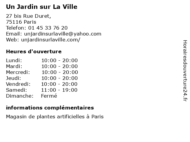 1 UN JARDIN SUR LA VILLE (Distance: 0,16 km) 55 Avenue Grande Armee, 75116 Paris 16ème jardin, la, sur, un, ville 2 Concept Au Jardin (Distance: 0,08 km) Rue Du Bois De Boulogne, 75116 Paris concept, jardin, restaurants 3 Jardin d'acclimatation (ouverture des grilles) - Vacances scolaires (Distance: 0,10 km) - Rue du Bois de Boulogne, 75116 Paris attractions, d'acclimatation, des, grilles, jardin, loisirs, ouverture, parc, scolaires, tourisme, vacances 4 Jardin d'acclimatation (caisses et attractions) - Vacances scolaires (Distance: 0,10 km) - Rue du Bois de Boulogne, 75116 Paris attractions, caisses, d'acclimatation, et, jardin, loisirs, parc, scolaires, tourisme, vacances 5 Jardin d'acclimatation (caisses et attractions) - Hors vacances scolaires (Distance: 0,10 km) - Rue du Bois de Boulogne, 75116 Paris attractions, caisses, d'acclimatation, et, hors, jardin, loisirs, parc, scolaires, tourisme, vacances 6 Dr Martine Jardin - Angiologue (Distance: 0,23 km) 7 Rue Chalgrin, 75116 Paris angiologie, angiologue, dr, jardin, martine, vaisseaux, vasculaire  |