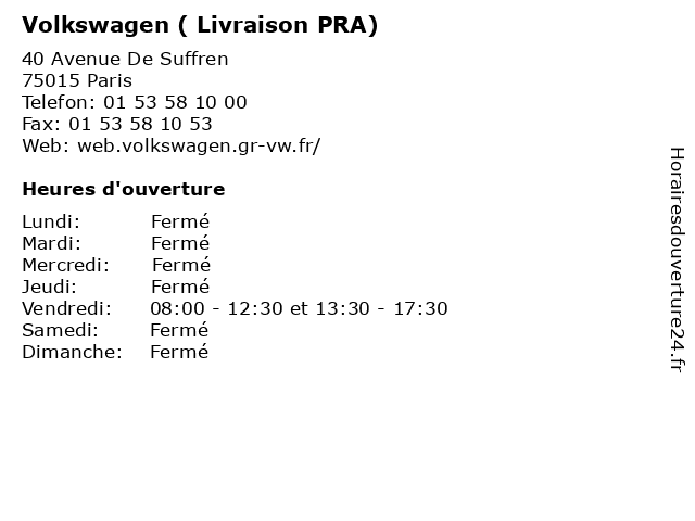 1 Volkswagen ( Livraison PRA) (Distance: 14,32 km) 48 Rue De La Varenne, 94100 Saint Maur Des Fosses automobiles, concessionnaire, garage, livraison, motos, pra, volkswagen 2 Volkswagen ( Livraison PRA) (Distance: 15,07 km) 113 Avenue de Rosny, 93250 Villemomble automobiles, concessionnaire, garage, livraison, motos, pra, volkswagen 3 Volkswagen (Distance: 0,00 km) 40 Avenue De Suffren, 75015 Paris automobiles, concessionnaire, garage, motos, volkswagen 4 Volkswagen (Atelier Carrosserie) (Distance: 0,00 km) 40 Avenue De Suffren, 75015 Paris atelier, automobiles, carrosserie, concessionnaire, garage, motos, volkswagen 5 Volkswagen ( Vente Pièces dOrigine) (Distance: 0,00 km) 40 Avenue De Suffren, 75015 Paris automobiles, concessionnaire, dorigine, garage, motos, pièces, vente, volkswagen 6 Volkswagen ( Ventes Accessoires dOrigine) (Distance: 0,00 km) 40 Avenue De Suffren, 75015 Paris accessoires, automobiles, concessionnaire, dorigine, garage, motos, ventes, volkswagen |