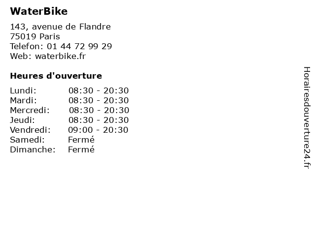 1 WaterBike (Distance: 3,77 km) 49, rue de Chateaudun, 75009 Paris aqua, gym, gymnase, le vélo, waterbike 5 6 WaterBike (Distance: 5,05 km) 11 boulevard de Charonne, 75011 Paris aqua, gym, gymnase, le vélo, waterbike |
