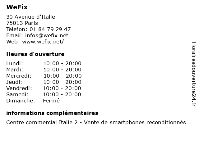 2 WeFix (Distance: 3,57 km) 101 Porte Berger, 75001 Paris réparation, services, smartphone, tablette, technique, wefix 4 WeFix (Distance: 4,15 km) 1 Avenue de la République, 75011 Paris réparation, services, smartphone, tablette, technique, wefix 5 WeFix (Distance: 7,03 km) 26 avenue des Ternes, 75017 Paris réparation, services, technique, wefix, électronique 6 WeFix (Distance: 7,99 km) s/n Rue du Luxembourg, 94320 Thiais réparation, services, technique, wefix, électronique  |