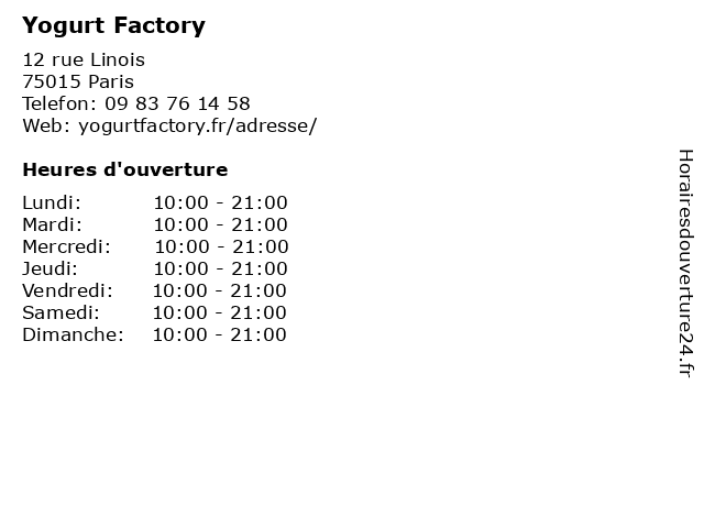 1 Yogurt Factory (Distance: 2,92 km) 17 Boulevard de Vaugirard, 75015 Paris boissons, factory, glace, magasin, pause, salon, snack, yaourt, yogurt 2 Yogurt Factory (Distance: 4,92 km) 30 Rue d'Alsace, 92300 Levallois-Perret dessert, factory, gaufres, milkshakes, smoothies, yogurt 3 Yogurt Factory (Distance: 4,99 km) 31 Rue d Alsace, 92300 Levallois Perret factory, restaurants, tera, yogurt 4 Yogurt Factory (Distance: 5,35 km) 3 rue St Merri, 75004 Paris dessert, factory, glace & yaourt glacé, restaurant français, salon de thé, yogurt 5 Yogurt Factory (Distance: 5,36 km) 42 Rue Rambuteau, 75003 Paris factory, gauffres, smoothies, yaourt glacé, yogurt 6 Yogurt Factory (Distance: 5,65 km) 63 rue des Abbesses, 75018 Paris dessert, factory, gaufres, milkshakes, smoothies, yogurt |