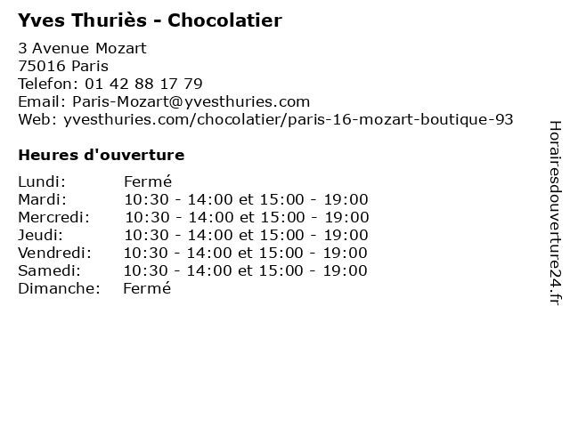1 Yves Thuriès - Chocolatier (Distance: 2,02 km) 57 rue du Commerce, 75015 Paris au lait, chocolat, chocolatier, confiserie, dragée, noir, thuriès, yves 2 Yves Thuriès - Chocolatier (Distance: 2,84 km) 5 Place des Ternes, 75017 Paris chocolaterie, chocolatier, chocolats, confiserie, gourmandises, thuriès, yves 3 Yves Thuriès - Chocolatier (Distance: 3,41 km) 150 Boulevard Jean Jaurès, 92100 Boulogne-Billancourt bonbons, chocolat, chocolatier, chocolats, confiserie, patisserie, patissier, thuriès, yves 4 Yves Thuriès - Chocolatier (Distance: 3,81 km) 2 Place Henri Barbusse, 92300 Levallois-Perret au lait, chocolat, chocolatier, confiserie, dragée, noir, thuriès, yves 5 Yves Thuriès - Chocolatier (Distance: 6,45 km) 5 rue de la Garenne, 92310 Sèvres au lait, chocolat, chocolatier, confiserie, dragée, noir, thuriès, yves 6 Yves Thuriès - Chocolatier (Distance: 7,40 km) 9 rue Saint Denis, 92700 Colombes artisans, boutique, cadeaux, chocolatier, chocolats, thuriès, yves, épicerie |
