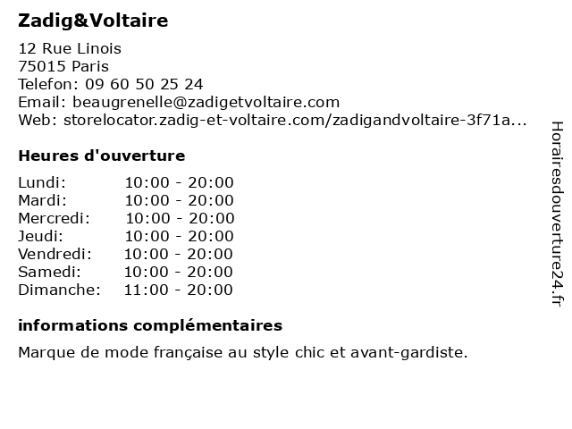 1 Zadig&Voltaire (Distance: 1,12 km) 16 Rue de Passy, 75016 Paris accessoires, deluxe, femme, mode, zadig&voltaire 2 Zadig&Voltaire (Distance: 1,13 km) 16 bis Rue De Passy, 75116 Paris magasin de vêtements pour enfants, magasin de vêtements pour hommes, magasin d’accessoires de mode, zadig&voltaire 3 Zadig&Voltaire (Distance: 1,35 km) 91 Avenue Paul Doumer Paris - 2ème étage, 75016 Paris accessoires, deluxe, femme, mode, zadig&voltaire 4 Zadig&Voltaire (Distance: 2,20 km) 3 Avenue Victor Hugo, 75016 Paris accessoires, deluxe, femme, mode, zadig&voltaire 5 Zadig&Voltaire (Distance: 2,94 km) 35 Avenue des Champs Elysées, 75008 Paris accessoires, deluxe, femme, mode, zadig&voltaire 6 |