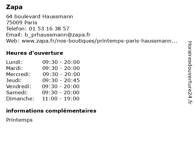 1 Zapa (Distance: 0,29 km) 40 Boulevard Haussmann, 75008 Paris accessoires, magasin, mode, pret à porter, vêtements, zapa 2 Zapa (Distance: 1,24 km) 97 rue de Courcelles, 75017 Paris accessories, clothes, féminin, homme, masculin, zapa 3 Zapa (Distance: 1,40 km) 22, rue des Abbesses, 75018 Paris accessories, clothes, féminin, masculin, zapa 4 Zapa (Distance: 2,60 km) 7 avenue Victor Hugo, 75016 Paris branché, femme, homme, jeans, manteau, mode, vetements, zapa 5 Zapa (Distance: 2,90 km) 98 rue Vieille du Temple, 75003 Paris accessoires, femmes, habillement, hommes, mode, pret-à-porter, vetements, zapa 6 Zapa (Distance: 3,50 km) 22 rue du Départ, 75015 Paris branché, femme, homme, jeans, manteau, mode, vetements, zapa |