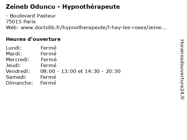 | Vendredi | 08:00-13:00 et 14:30-20:30 |