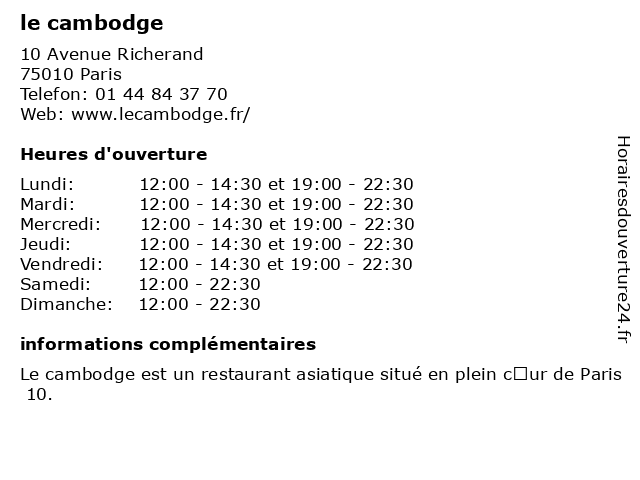 1 Le Cambodge (Distance: 2,35 km) 20 Rue Yvonne Le Tac, 75018 Paris baguettes, cambodge, le, nem, restaurants, riz, vermicelles 2 Le Petit Cambodge (Distance: 0,15 km) 20 Rue Alibert, 75010 Paris asiatique, cambodge, le, petit, restaurant 4 Le Petit Cambodge (Distance: 0,39 km) 4 Rue Beaurepaire, 75010 Paris 20, 22, asiatique, cambodge, le, petit, restaurants 5 Le Cambodge 17 (Distance: 3,94 km) 22 Rue Lebouteux, 75017 Paris 17, cambodge, kong, le, restaurants, vong 6 New Cambodge (Distance: 4,38 km) 8 Rue de Wattignies, 75012 Paris bar, bistro, bistrot, brasserie, café, cambodge, new, restaurant, restauration |