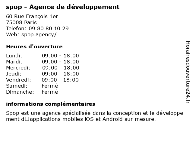 1 4gency | Agence Web Paris | Développement Sur Mesure & Design (Distance: 0,37 km) 50 Avenue Des Champs-élysées, 75008 Paris 4gency, agence, agence de design, agence de marketing web, agence de publicité, consultant marketing, design, décorateur d'intérieur, développement, graphiste, mesure, paris, société d'hébergement web, sur, web 2 Celuga - Agence de Développement Web (Distance: 0,53 km) 9 rue d'Artois, 75008 Paris agence, celuga, de, développement, informatique, ordinateur, réparation, web, éditeur de site web 3 Valeurs & Développement (Distance: 0,89 km) 70 avenue Kléber, 75116 Paris accompagnement, coaching, développement, talents, valeurs 4 ADRC - Agence pour le Développement Régional du Cinéma (Distance: 2,26 km) 16 Rue d'Ouessant, 75015 Paris a.d.r.c, adrc, agence, cinéma, du, développement, le, pour, régional 5 Recyclage Solidaire / Soleil et Développement (Distance: 5,06 km) 35 rue Ernest Renan, 92130 Issy les Moulineaux coordinateur, développement, environnement, et, la protection, recyclage, soleil, solidaire 6 Institut Francophone Pour le Développement du Self Leadership - IFS-association (Distance: 5,25 km) 40 rue de la Tour, 92240 Malakoff association, connaissance, diffusion, du, développement, enseignement, francophone, ifs, institut, le, leadership, pour, self, self leadership |