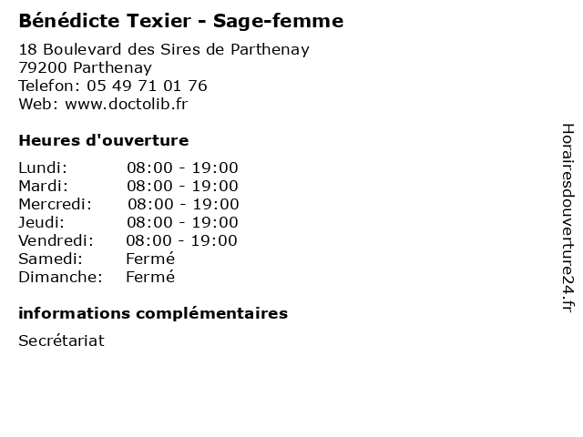 2 Croq'Fruits (Distance: 2,82 km) lieu-dit La Jamonière, 79200 Parthenay alimentation, croq, croq'fruits, divers, fabrice, fruits, magasins, parthenay, texier 3 Saboureau Texier Julien (Distance: 24,76 km) 11 bis Route Océane, 86470 Boivre-la-Vallée julien, saboureau, texier 4 Dr Virginie Rassinoux Texier - Médecin généraliste (Distance: 39,00 km) 9 Rue de L'outarde Canepetière, 86170 Neuville-de-Poitou docteur, dr, generaliste, généraliste, medical, médecin, rassinoux, soin, texier, virginie 5 Dr Charles-Henri Texier - Chirurgien orthopédiste (Distance: 39,88 km) 84 route d'Aiffres, 79027 Niort charles, chirurgien, consultation, docteur, dr, henri, med, médecin, médecine, orthopédiste, texier, traitement 6 |