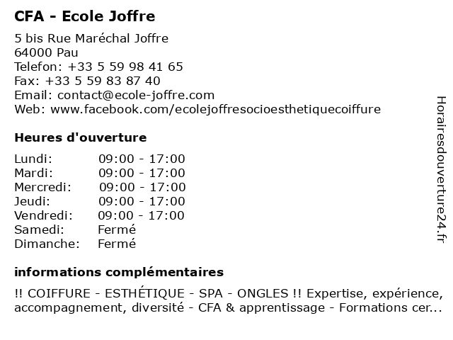 1 Le Joffre (Distance: 1,77 km) 8 Place du Maréchal Joffre, 64320 Bizanos joffre, le, repas, restaurants, restauration 2 Ecole de Conduite Ossau (Distance: 0,28 km) 9 rue Léon Daran, 64000 Pau auto, code, conduite, cours, de, ecole, formations, moto, ossau, voiture, école 3 Auto-école de Verdun (Distance: 0,42 km) 26 rue de Liège, 64000 Pau auto, de, ecole, permis, verdun, école 6 Auto-Ecole AMS (Distance: 0,82 km) 5 Bis Avenue 18ème Régiment d'Infanterie, 64000 Pau a.m.s, ams, auto, ecole, formations, groupe, école |