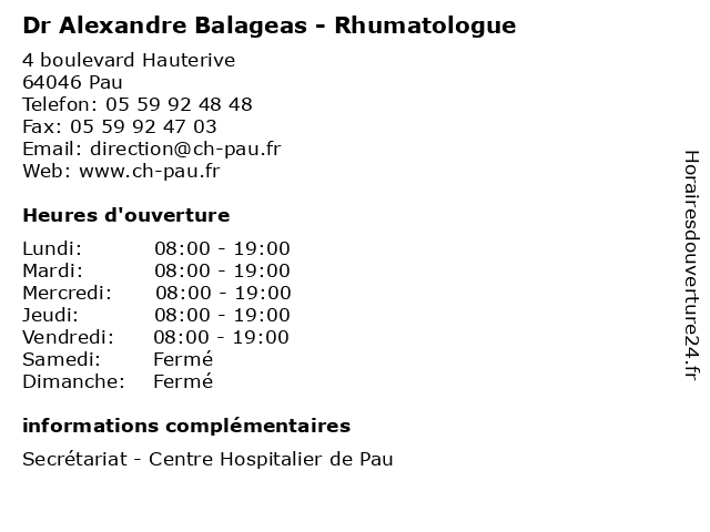 1 Dr Alexandre Massri - Anesthésiste (Distance: 0,00 km) 4 boulevard Hauterive, 64046 Pau alexandre, anesthésiste, consultation, docteur, dr, massri, med, médecin, traitement 2 Alexandre Monaret - Ostéopathe (Distance: 1,83 km) 45 Boulevard Tourasse, 64000 Pau alexandre, monaret, osteo, osteopathe, ostéopathe, sante, soins 3 Dr Alexandre Diot - Psychiatre (Distance: 2,58 km) 29 Avenue du Général Leclerc, 64000 Pau alexandre, consultation, diot, docteur, dr, med, médecin, psychiatre, traitement 4 Rodrigues Alexandre (Distance: 3,00 km) Poissonnerie Rodrigues a Residence Teresa Batiment, 64000 Pau alexandre, boucheries, poissonneries, rodrigues 5 Alexandre Lanouguere - Ostéopathe (Distance: 3,57 km) 10 Rue Perpignaa, 64000 Pau alexandre, lanouguere, ostéo, ostéopathe, ostéopathes, soins 6 Tavares Alexandre Christian (Distance: 5,53 km) 29 Rue Saint Marc, 64320 Idron alexandre, christian, restaurants, tavares |
