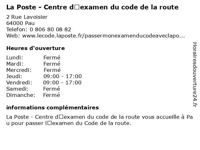 Termes de recherche pour La Poste - Centre d’examen du code de la route:poste, la, du, de, route, centre, code, d’examen, centre d'évaluation scolaire, école technique |