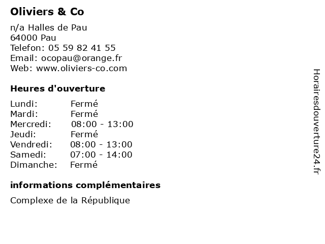 1 Oliviers & Co (Distance: 0,50 km) 24 Rue du Maréchal Joffre, 64000 Pau co, condiment, olive oil, oliviers, passion, table arts, trade, truffle, vinegar 2 CT & Co (Distance: 0,43 km) 6 rue de la Gendarmerie, 64000 Pau agence, and, co, communication, ct, design, informatique, solutions, web 3 Columbus Café & Co (Distance: 0,47 km) 64 avenue du maréchal de lattre de Tassigny, 64000 Pau bar, boissons, café, cafés, chaudes, chocolat, co, coffee-shop, columbus, expressos, muffins, restaurant, restauration, sandwichs, thé 4 AL&CO - Agence d’Emploi (Distance: 0,54 km) 1 rue de Liège, 64000 Pau agence, al&co, d’emploi, emploi, groupe, généraliste, industrie 5 Jumo & Co (Distance: 0,58 km) 6 rue Henri IV, 64000 Pau café, co, desserts, jumo, pâtisserie, restaurant, salon de thé 6 Archi D&CO (Distance: 3,39 km) 47 Boulevard Charles de Gaulle, 64140 Lons archi, archi d&co, architecte, d&co, décoration, intérieur, lons, rénovation |