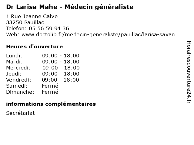 1 Dr Clara Rico-Mahe - Chirurgien-dentiste - secrétariat (Distance: 31,66 km) 5 Route de Saint-Médard, 33160 Saint-Aubin-de-Médoc chirurgien, chirurgien-dentiste, clara, dentiste, dr, mahe, médecins, médicaments, rico, santé, secrétariat, spécialiste 2 Dr Catherine Mahe Seguela - Médecin généraliste (Distance: 40,32 km) 50 Cours Balguerie Stuttenberg, 33300 Bordeaux catherine, consultation, docteur, dr, généraliste, mahe, med, médecin, seguela, traitement 3 Mahe Impression (Distance: 48,16 km) 31 Route de Paris, 33910 Saint-Denis-de-Pile communication, couleurs, entreprise, impression, mahe, numerique, projet 5 Sophie Cornu - Sage-femme (Distance: 0,86 km) 50 Bis rue du Maréchal Joffre, 33250 Pauillac cornu, femme, medical, sage, sagefemme, sophie 6 Dr. Jean-Luc Gonzalez - Médecin généraliste (Distance: 0,86 km) 50 B Rue du Maréchal Joffre, 33250 Pauillac consultation, docteur, domicile, dr., en, gonzalez, générale, généraliste, jean, luc, médecin, médecine, santé, visite |