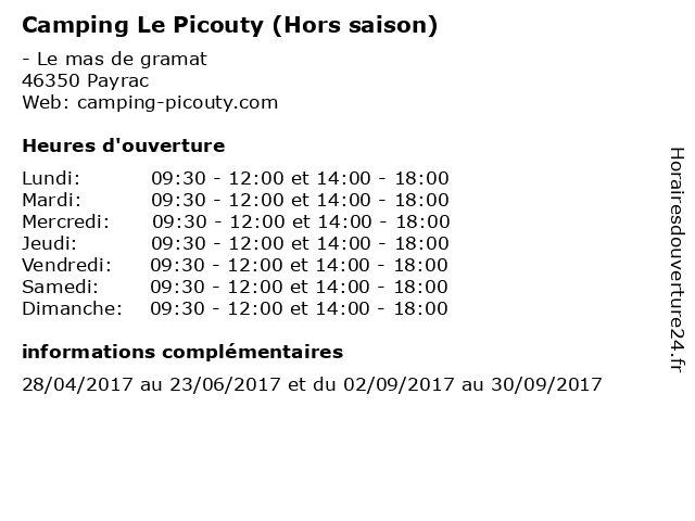 1 Camping Le Picouty (En saison) (Distance: 0,00 km) - Le mas de gramat, 46350 Payrac camping, chalet et loisirs, en, le, picouty, saison, tente, vacances 2 Camping Les Pins - Réception (basse saison) (Distance: 1,99 km) - Avenue de Toulouse, 46350 Payrac en Quercy basse, camping, hebergement, les, pins, réception, saison, tourisme 3 Camping Les Pins - Réception (haute saison) (Distance: 1,99 km) - Avenue de Toulouse, 46350 Payrac en Quercy camping, haute, hebergement, les, pins, réception, saison, tourisme 4 Camping Les Cigales - Hors saison (Distance: 11,48 km) - L'Hospitalet, 46500 Rocamadour camping, caravaning, cigales, en, hors, les, loisirs, réception, saison, tourisme, vacances 5 Camping Le Roc - Hors saison (Distance: 13,73 km) - Lieu-dit Pech Alis, 46500 Rocamadour accueil, camping, caravaning, hors, le, loisirs, roc, saison, tourisme, vacances 6 Camping Domaine de la Paille Basse (Réception, du 8 Janvier au 6 Avril) (Distance: 16,04 km) - La Paille Basse, 46200 Souillac au, avril, basse, camping, de, domaine, du, hebergement, janvier, la, paille, réception, tourisme |