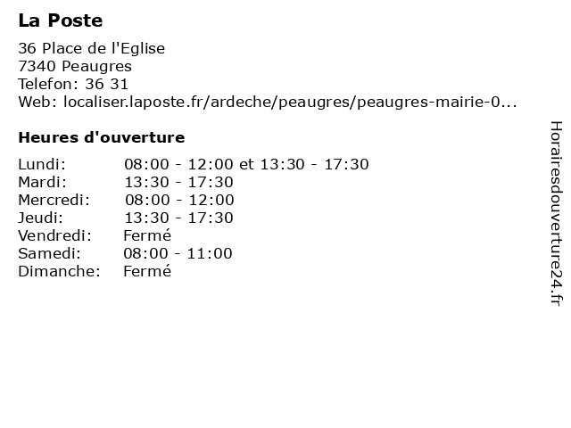1 La Poste (Distance: 3,40 km) - Place de la Mairie, 07340 Felines agence, colis, courriers, expédition, la, postale, poste, relais 3 La Poste (Distance: 5,73 km) - Place de la Mairie, 07340 Champagne agence, colis, courriers, expédition, la, postale, poste, relais 5 La Poste (Distance: 5,96 km) - Le Bourg, 07430 Vernosc-lès-Annonay agence, assurance, banque, banque postale, bureau de poste, chronopost, colis, courrier, dps, expéditions internationales, la, point, postale, poste, relais, timbres, téléphonie, ups, western union 6 |