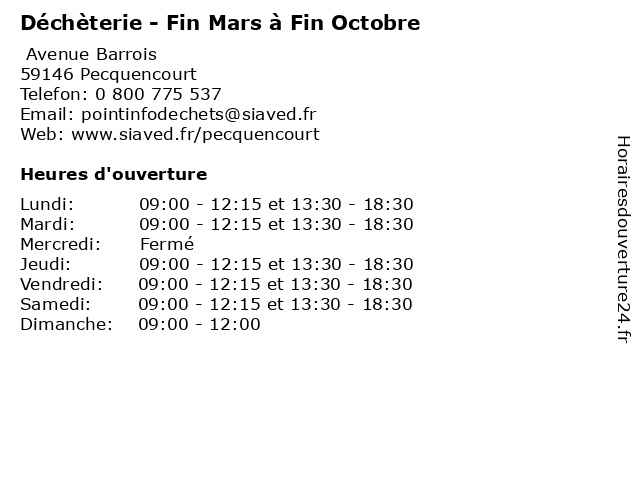 1 Déchèterie - Fin Mars à Fin Octobre (Distance: 6,40 km) - rue Jean Jaurès Prolongée, 59580 Aniche bennes, débarras, déchèterie, détritus, fin, mars, octobre, ordures, poubelles 2 Déchèterie - Fin Mars à Fin Octobre (Distance: 8,43 km) - Rue des Mines, 59171 Erre bennes, débarras, déchèterie, détritus, fin, mars, octobre, ordures, poubelles 3 Déchèterie - Fin Mars à Fin Octobre (Distance: 13,54 km) - Rue Émile Pierronne, 59293 Neuville-sur-Escaut bennes, débarras, déchèterie, détritus, fin, mars, octobre, ordures, poubelles 4 Déchèterie - Fin Mars à Fin Octobre (Distance: 15,83 km) - Rue du champ d'Oiseaux, 59230 Saint-Amand-les-Eaux bennes, débarras, déchèterie, détritus, fin, mars, octobre, ordures, poubelles 5 Déchèterie - Fin Mars à Fin Octobre (Distance: 18,14 km) - Rue Louise de Bettignies, 59195 Hérin bennes, débarras, déchèterie, détritus, fin, mars, octobre, ordures, poubelles 6 Déchèterie - Fin Octobre à Fin Mars (Distance: 0,00 km) Avenue Barrois, 59146 Pecquencourt bennes, débarras, déchèterie, détritus, fin, mars, octobre, ordures, poubelles |