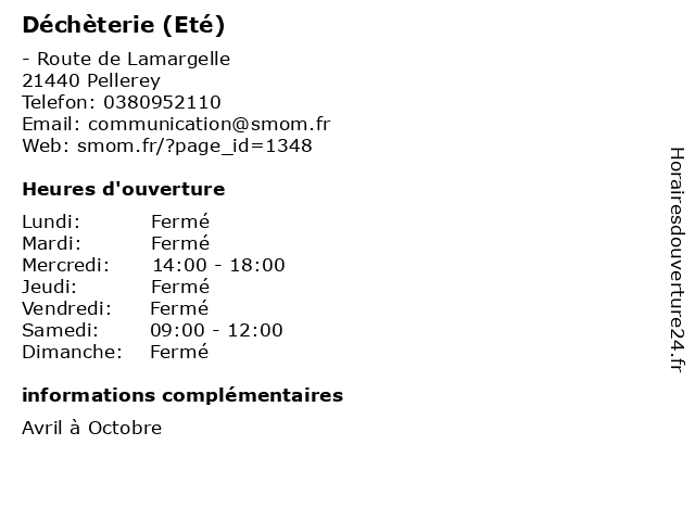1 Déchèterie (Eté) (Distance: 14,89 km) 2-6 Rue du Stade, 21450 Baigneux-les-Juifs avril, bennes, débarras, déchèterie, détritus, eté, ordures, poubelles, septembre 2 Déchèterie (Eté) (Distance: 17,03 km) - Rue du Mini Golf, 21370 Prenois avril, bennes, débarras, déchèterie, détritus, eté, octobre, ordures, poubelles 3 Déchèterie (Eté) (Distance: 18,26 km) - route départementale 120, 21120 Saulx-le-Duc avril, bennes, débarras, déchèterie, détritus, eté, octobre, ordures, poubelles 4 Déchèterie (Eté) (Distance: 19,14 km) - lieu-dit Combe Epachenet, 21510 Moitron avril, bennes, débarras, déchèterie, détritus, eté, ordures, poubelles, septembre 5 Déchèterie (Hiver) (Distance: 0,00 km) - Route de Lamargelle, 21440 Pellerey bennes, débarras, déchèterie, détritus, hiver, mars, novembre, ordures, poubelles 6 Déchèterie (Hiver) (Distance: 14,89 km) 2-6 Rue du Stade, 21450 Baigneux-les-Juifs bennes, débarras, déchèterie, détritus, hiver, mars, octobre, ordures, poubelles |