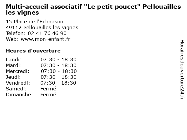 Termes de recherche pour Multi-accueil associatif "Le petit poucet" Pellouailles les vignes:les, petit, vignes, accueil, multi, pellouailles, child care, caregivers houses, family home, home care, kindergartens, micro-nurseries, parental home, associatif, "le, poucet" |