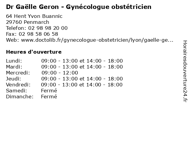 1 Dr Gaëlle Geron - Gynécologue obstétricienne (Distance: 0,16 km) 64 Hent Yvon Buannic, 29760 Penmarch dr, gaëlle, geron, gynécologie, gynécologue, obstétricienne, obstétrique 2 Gaëlle Besse Savon d'Artisan (Distance: 15,52 km) - Impasse de la Mairie, 29710 Pouldreuzic artisan, besse, d'artisan, gaëlle, naturels, pouldreuzic, production, savon 5 Dr. Abou Khalil Nourallah - Gynécologue obstétricien (Distance: 58,29 km) 20 bis avenue Général Leclerc, 29300 Quimperlé abou, consultation, docteur, dr., gynécologue, khalil, med, médecin, médecine, nourallah, obstétricien, traitement 6 Dr Bernard Bredillat - Gynécologue obstétricien (Distance: 58,29 km) 20 bis avenue Général Leclerc, 29300 Quimperlé bernard, bredillat, consultation, docteur, dr, gynécologue, med, médecin, médecine, obstétricien, traitement |