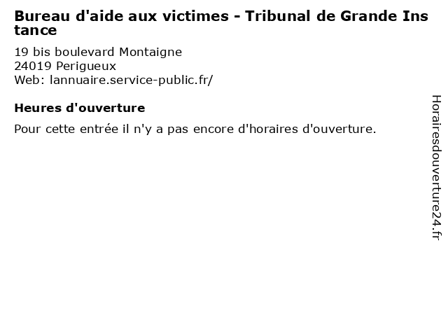 Termes de recherche pour Bureau d'aide aux victimes - Tribunal de Grande Instance:du, de, grande, aux, administration, bureau, services, perigueux, publics, tribunal, instance, victimes, d'aide |