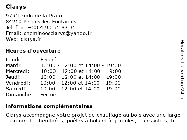 1 Cheminées & Poêles Clarys (Distance: 19,02 km) 325 Allée de l Escadron 1 5 Vendée, 84100 Orange bois, cheminées, clarys, entretien, granules, installation, poêles, vente 2 Clarys- Côte Poêles (Distance: 19,12 km) 325 Allée de l'Escadron 1-5 de Vendee, 84100 Orange clarys, côte, poêles |