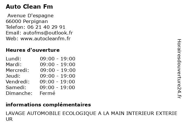 1 WORK CLEAN (Distance: 3,00 km) 13 Rue des Serenades, 66100 Perpignan clean, entretien piscine, entretien toiture, nettoyage automobile à domicile, nettoyage bâtiment, nettoyage façade, nettoyage industriel, nettoyage toiture, nettoyage écologique, work 4 Drop & Clean (Distance: 5,28 km) 44 rue Hector Guimard, 66000 Perpignan automatique, clean, drop, lavage, laverie, linge, séchage 5 Pressing Éco Clean (Distance: 14,57 km) 19 Avenue Maréchal Foch, 66250 Saint-Laurent-de-la-Salanque clean, lavage, laver, laverie, pressing, éco, écologiques 6 |