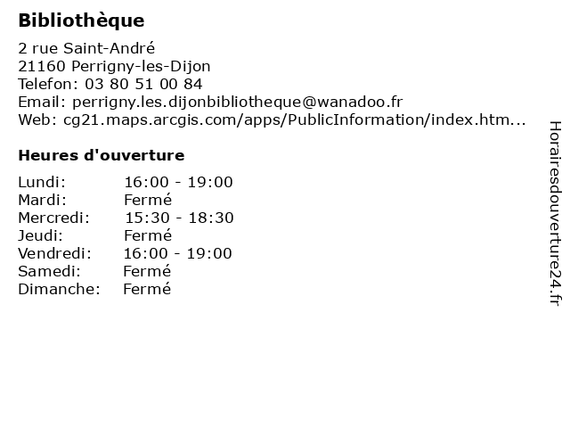1 Bibliothèque (Distance: 1,38 km) . Place Schweich An Der Mosel, 21160 Marsannay-la-Cote bibliothèque, cd audio, cd.rom, livres, revues 2 Bibliothèque (Distance: 2,30 km) . Place Charles de Gaulle, 21160 Couchey bibliothèque, cd audio, cd.rom, livres, revues 3 Bibliothèque (Distance: 8,77 km) 9 rue du Moulin, 21370 Plombieres-les-Dijon bibliothèque, cd audio, cd.rom, livres, revues 4 Bibliothèque (Distance: 9,65 km) 8 rue de Dijon, 21121 Daix bibliothèque, cd audio, cd.rom, livres, revues 5 Bibliothèque (Distance: 11,00 km) 4 rue des Riottes, 21121 Hauteville-les-Dijon bibliothèque, cd audio, cd.rom, livres, revues 6 Bibliothèque (Distance: 11,58 km) 4 rue des Écoles, 21121 Ahuy bibliothèque, cd audio, cd.rom, livres, revues |