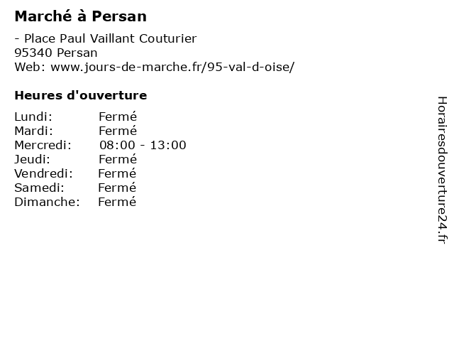 | 1 Le Café du Marché (Distance: 0,24 km) 124 Avenue Gaston Vermeire, 95340 Persan bar, bistro, bistrot, brasserie, café, du, le, marché, restaurant, restauration 2 Marché à Beaumont-sur-Oise (Distance: 1,35 km) - Place du château, 95260 Beaumont-sur-Oise beaumont, frutas, hortalizas, marché, mercado, oise, sur, verduras 4 Marché de Chambly (Distance: 2,37 km) . Place Charles-de-Gaulle, 60230 Chambly alimentaire, chambly, de, fleur, habillement, marché, services 5 Marché de Neuilly-en-Thelle (Distance: 3,35 km) . Rue de Ville, 60530 Neuilly-en-Thelle alimentaire, de, en, fleur, habillement, marché, neuilly, services, thelle 6 Marché de Saint-Leu-d'Esserent (Distance: 10,08 km) . Village, 60340 Saint-Leu-d'Esserent alimentaire, d'esserent, de, fleur, habillement, leu, marché, saint, services |