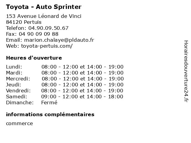 1 Auto Sprinter (Distance: 20,79 km) 365 Chemin de la Pioline, 13290 Aix-en-Provence accessoires, après-vente, auto, contrôle technique, pièces de rechange, sprinter, véhicules d'occasion, véhicules neufs 2 Suzuki - AUTO SPRINTER - Espace Commercial (Distance: 21,22 km) - Rue Pierre Leydet, 13290 Aix-en-Provence auto, commercial, entretien, espace, révisions, services d'automobiles, sprinter, suzuki, vidanges 3 Suzuki - AUTO SPRINTER - Espace Occasions (Distance: 21,22 km) - Rue Pierre Leydet, 13290 Aix-en-Provence auto, entretien, espace, occasions, révisions, services d'automobiles, sprinter, suzuki, vidanges 4 Suzuki - AUTO SPRINTER - Service Après-Vente (Distance: 21,22 km) - Rue Pierre Leydet, 13290 Aix-en-Provence après, auto, entretien, révisions, service, services d'automobiles, sprinter, suzuki, vente, vidanges 5 Suzuki - AUTO SPRINTER - Magasin (Distance: 21,22 km) - Rue Pierre Leydet, 13290 Aix-en-Provence auto, entretien, magasin, révisions, services d'automobiles, sprinter, suzuki, vidanges 6 Toyota Auto Sprinter (Distance: 36,49 km) 130 Avenue Jacques Prevert, 13730 Saint Victoret atelier, auto, automobiles, garage, motos - concessionnaire, sprinter, toyota |