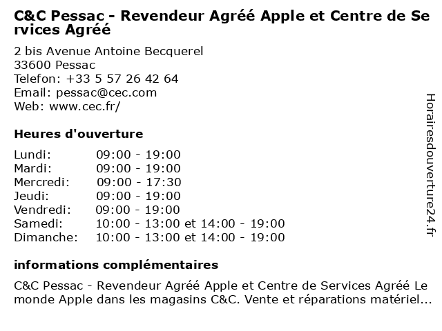 | Samedi | 10:00-13:00 et 14:00-19:00 |