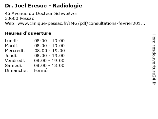 1 Dr. Joel Conan - Anesthesistes (Distance: 0,00 km) 46 Avenue du Docteur Schweitzer, 33600 Pessac anesthesistes, conan, docteur, dr., joel, medecins, sante 2 Benoot Valentin Joel Claude (Distance: 2,93 km) 239 Rue Mouneyra, 33000 Bordeaux benoot, claude, joel, restaurants, valentin 3 Medecin Joel Ohayon (Cardiologue) (Distance: 4,73 km) 68 Rue du Palais Gallien, 33000 Bordeaux cardiologue, docteur, joel, medecin, ohayon, sante, services 4 Medecin Joel Carrera (Médecin généraliste) (Distance: 4,88 km) 84 Albert Barraud, 33000 Bordeaux carrera, docteur, généraliste, joel, medecin, médecin, sante, services 5 Medecin Joel Carrera - Consultation à domicile (Médecin généraliste) (Distance: 4,88 km) 84 Albert Barraud, 33000 Bordeaux carrera, consultation, docteur, domicile, généraliste, joel, medecin, médecin, sante, services 6 Le Monde de Joel Robuchon (Distance: 5,44 km) 10 rue Labottière, 33000 Bordeaux de, dessert, food, joel, le, monde, restaurant, robuchon |