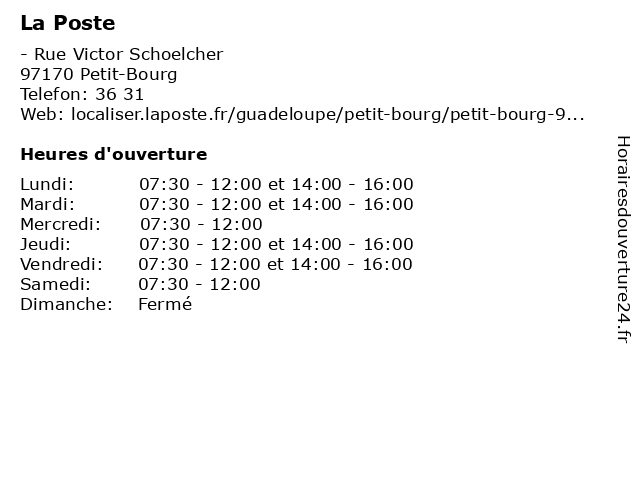 1 La Poste (Distance: 0,07 km) - Rue Gerville Reache, 97114 Trois-Rivières agence, colis, courriers, expédition, la, postale, poste, relais 2 La Poste (Distance: 6,04 km) - ZAC Houelbourg Sud II, 97122 Baie-Mahault agence, colis, courriers, expédition, la, postale, poste, relais 3 La Poste (Distance: 6,72 km) - Rue des Ecoles, 97128 Goyave agence, colis, courriers, expédition, la, postale, poste, relais 4 La Poste (Distance: 8,02 km) s/n Rue Amédée Fengarol, 97100 Basse-Terre agence, banque, bureau de poste, colis, courrier, expéditions internationales, la, point, postale, poste, relais 5 La Poste (Distance: 8,13 km) - Rue Euvremont Gene, 97110 Pointe-à-Pitre agence, colis, courriers, expédition, la, postale, poste, relais 6 La Poste (Distance: 8,29 km) - Rue de la République, 97122 Baie-Mahault agence, colis, courriers, expédition, la, postale, poste, relais |
