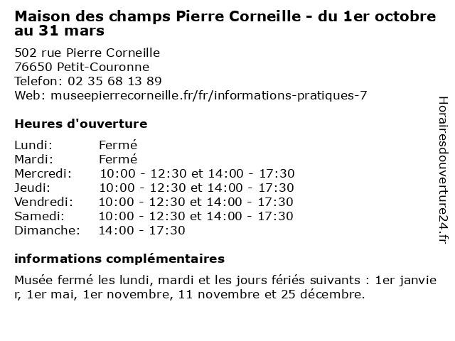 Termes de recherche pour Maison des champs Pierre Corneille - du 1er octobre au 31 mars:du, champs, pierre, au, des, musée, maison, mars, 1er, 31, octobre, exposition, corneille, visite |