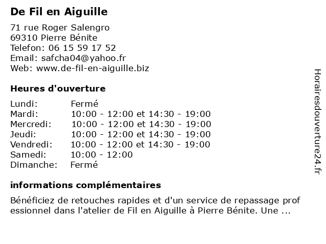 | Mercredi | 10:00-12:00 et 14:30-19:00 |