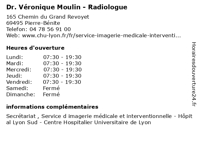 1 Dr Véronique Lapras - Radiologue (Distance: 0,00 km) 165 Chemin du Grand Revoyet, 69495 Pierre-Bénite consultation, docteur, dr, lapras, med, médecin, médecine, radiologue, traitement, veronique, véronique 2 Dr Véronique Uran - Psychiatre (Distance: 1,07 km) 36 Rue de la Sarra, 69600 Oullins dr, folie, psychiatre, psychiatrie, psychiatrique, uran, veronique, véronique 3 Ateliers Du Moulin A Vent (Distance: 3,63 km) 22 Rue de Bourrelier, 69190 Saint-Fons ateliers, du, moulin, vent 4 KFC Lyon Moulin a Vent (Distance: 4,09 km) 383 Route de Vienne, 69200 Vénissieux kfc, lyon, moulin, vent 5 R2c - Moulin à Vent (Distance: 4,17 km) 33 Avenue du Docteur Georges Levy, 69200 Venissieux caféria, dessert, grill, moulin, plats chauds, r2c, restaurant, sandwich, vent 6 Véronique Villisek - Masseur-kinésithérapeute (Distance: 4,54 km) 38 Avenue du Général de Gaulle, 69110 Sainte-Foy-lès-Lyon kiné, kinésithérapeute, masseur, rééducation, soin, villisek, véronique |