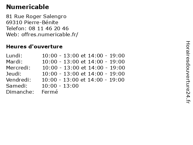 1 Numericable (Distance: 1,76 km) . Place Valmy, 69009 Lyon internet, mobile, multimedia, numericable, services, telephone 2 Numericable (Distance: 5,37 km) 54 Avenue Jean Jaurès, 69007 Lyon internet, mobile, multimedia, numericable, services, telephone 3 Numericable (Distance: 7,47 km) 97 Rue de Créqui, 69006 Lyon internet, mobile, multimedia, numericable, services, telephone 4 Numericable (Distance: 7,79 km) 216 Avenue Franklin Roosevelt, 69500 Bron internet, mobile, multimedia, numericable, services, telephone 5 Numericable (Distance: 8,30 km) 64 Cours Emile Zola, 69100 Villeurbanne internet, mobile, multimedia, numericable, services, telephone 6 Relay (Distance: 1,27 km) 165 Chemin du gd Revoyet, 69495 Pierre Benite beverages, food, gifts, paper, printing, relay, service products, telephone |