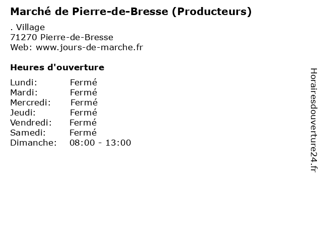 1 Marché de Pierre-de-Bresse (Distance: 0,00 km) . Village, 71270 Pierre-de-Bresse alimentaire, bresse, de, fleur, habillement, marché, pierre, services 2 Marché des Producteurs à Pierre-de-Bresse (Distance: 6,11 km) - Centre, 71270 Pierre-de-Bresse bresse, d'arnoult, de, des, frutas, hortalizas, l'abbé, marché, mercado, pierre, pont, producteurs, verduras 3 Marché à Lugny (Distance: 6,11 km) - Centre, 71270 Pierre-de-Bresse d'arnoult, frutas, hortalizas, l'abbé, lugny, marché, mercado, pont, verduras 4 Marché de Bellevesvre (Distance: 8,38 km) . Grande Rue, 71270 Bellevesvre alimentaire, bellevesvre, de, fleur, habillement, marché, services 5 Marché de producteurs de la plaine Jurassienne à Les Hays (Distance: 8,95 km) . Ville, 39120 Les Hays de, frutas, hays, hortalizas, jurassienne, la, les, marché, mercado, plaine, producteurs, verduras 6 Marché à Losne (Distance: 18,11 km) . Ville, 21170 Losne frutas, hortalizas, losne, marché, mercado, verduras |