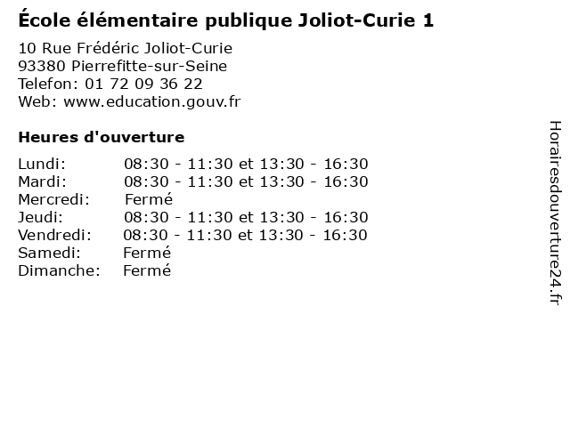 1 École élémentaire publique Joliot-Curie 1 (Distance: 10,99 km) 14 Rue Irène et Frédéric Joliot Curie, 93100 Montreuil cours, curie, education, joliot, publique, services, École, école, élémentaire 2 École élémentaire publique Joliot-Curie 1 (Distance: 14,33 km) 7 Allée Fernand Lindet, 93390 Clichy-sous-Bois cours, curie, education, joliot, publique, services, École, école, élémentaire 3 École maternelle publique Joliot-Curie (Distance: 0,00 km) 10 Rue Frédéric Joliot-Curie, 93380 Pierrefitte-sur-Seine cours, curie, education, joliot, maternelle, publique, services, École, école 4 École Elémentaire Publique Joliot-Curie 2 (Distance: 0,00 km) 10 Rue Frédéric Joliot-Curie, 93380 Pierrefitte-sur-Seine cours, curie, education, elémentaire, joliot, publique, services, École, école, élémentaire 5 École maternelle publique Joliot-Curie (Distance: 1,34 km) 8 Avenue Paul Vaillant Couturier, 93240 Stains cours, curie, education, joliot, maternelle, publique, services, École, école 6 École élémentaire publique Joliot-Curie (Distance: 1,41 km) 1 Avenue Paul Vaillant Couturier, 93240 Stains cours, curie, education, joliot, publique, services, École, école, élémentaire |