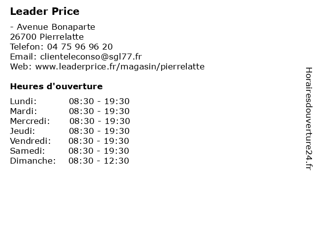 1 Leader Price (Distance: 17,78 km) . Route de Marseille, 26200 Montélimar alimentaire, alimentation, distributeur, fruits, grande distribution, hypermarché, leader, légumes, price, supermarché, supérette, épicerie 2 Leader Price (Distance: 18,58 km) - Route de Valreas, 84600 Grillon fruits, leader, market, price, supermarket 3 Leader Price (Distance: 18,58 km) , Route de Valreas, 84600 Grillon bio, hypermarket, leader, marques, price 4 Leader Price (Distance: 19,53 km) 98 Rue De La Republique, 07400 Le teil bio, hypermarket, leader, marques, price 5 Leader Intérim (Distance: 11,15 km) 38 Cours de la République, 84500 Bollène agence, interim, intérim, leader 6 Leader Intérim (Distance: 18,11 km) - Chemin des Blaches du Levant, 26200 Montelimar agence, interim, intérim, leader |