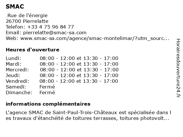 1 SMAC Assistance Service (Distance: 2,82 km) 135 Rue de l'énergie, 26700 Pierrelatte assistance, service, smac |