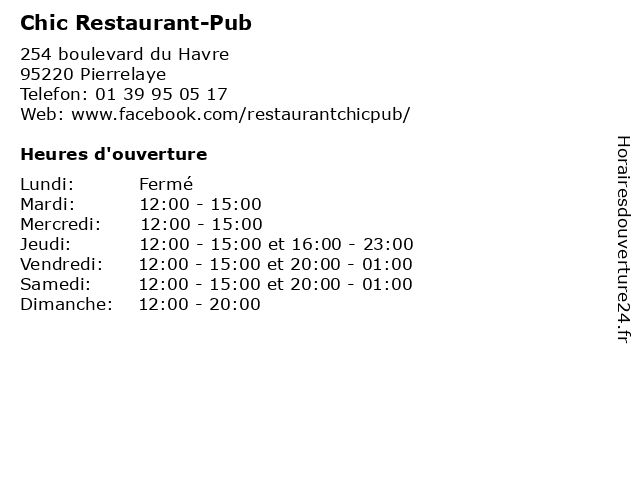 1 Chic Restaurant-Pub (Distance: 0,03 km) 254 Boulevard Du Havre, 95220 Pierrelaye bar, bistro, bistrot, brasserie, café, chic, pub, restaurant, restauration, resto 2 O'Sullivans Pub (Distance: 13,35 km) 3 Rue De Pontoise, 78100 St Germain En Laye bar, boissons, cocktail, germain, musique, o'sullivans, pub, restauran, st. 3 The Canadian Embassy Pub (Distance: 15,96 km) 71 Boulevard Gouvion St-Cyr, 75017 Paris bar, boissons, canadian, cocktail, embassy, musique, pub, restauran, the 6 Sarl La Havane Pub (Distance: 17,44 km) 18 Avenue Pierre Semard, 95400 Arnouville havane, pub, restaurants |