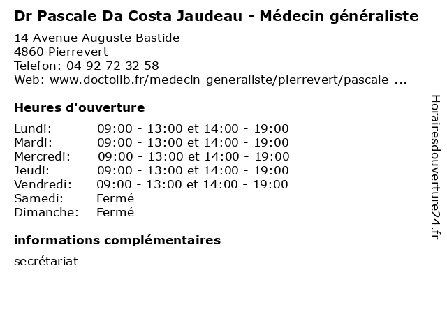 1 Dr Robert Costa - Endocrinologue (Distance: 3,59 km) 157 Avenue Jean Giono, 04100 Manosque consultation, costa, docteur, dr, endocrinologue, med, médecin, médecine, robert, secrétariat, traitement 2 Catherine Costa-Migret (Distance: 3,62 km) 18 Avenue Jean Giono, 04100 Manosque catherine, costa, migret 3 Dr Pascale Redon - Psychiatre (Distance: 3,71 km) 2 Rue de l’Eden, 04100 Manosque dr, folie, pascale, psychiatre, psychiatrie, psychiatrique, redon 4 Pascale Seiler - Sage-femme (Distance: 5,18 km) - Rue Auguste Girard, 04100 Manosque consultation, docteur, dr, femme, med, médecin, pascale, sage, seiler, traitement 5 Chez Pascale & Emilie (Distance: 13,00 km) Jules Horowitz, 13115 Saint Paul Les Durance chez, emilie, pascale, restaurants 6 Pereira da Costa Marco (Distance: 13,25 km) 241 Chemin du Stade, 04180 Villeneuve costa, da, marco, pereira |