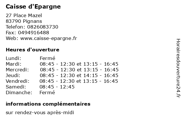 1 Caisse D'epargne (Distance: 9,71 km) . Avenue Lazare Carnot, 83610 Collobrières banque, caisse, carte, d'epargne, services 2 Caisse d'Epargne (Distance: 12,19 km) - Zac du Fray Redon, 83136 Rocbaron banque, caisse, carte, d'epargne, epargne, services 3 Caisse d'Epargne (Distance: 14,34 km) . Place De La Convention, 83390 Cuers banque, caisse, carte, d'epargne, services 4 Caisse d'Epargne (Distance: 14,92 km) 15 Boulevard Capitaine Audibert, 83136 Garéoult banque, caisse, carte, d'epargne, services 5 Caisse d'Epargne (Distance: 17,46 km) . Avenue Maréchal Foch, 83170 Brignoles agence, banque, caisse, carte, crédit, d'epargne, prêt, services 6 Caisse D'epargne (Distance: 19,81 km) . Place Gabriel Peri, 83570 Carcès banque, caisse, carte, d'epargne, d'épargne, services |